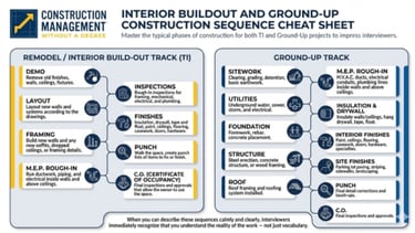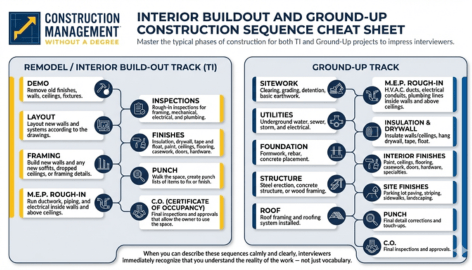 Who the players are, how they interact, and where PMs fit🧱 The Interior Buildout / Ground-Up Sequence Cheat Sheet